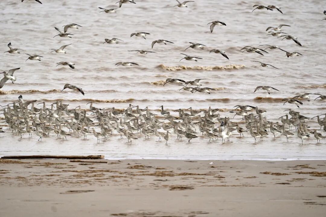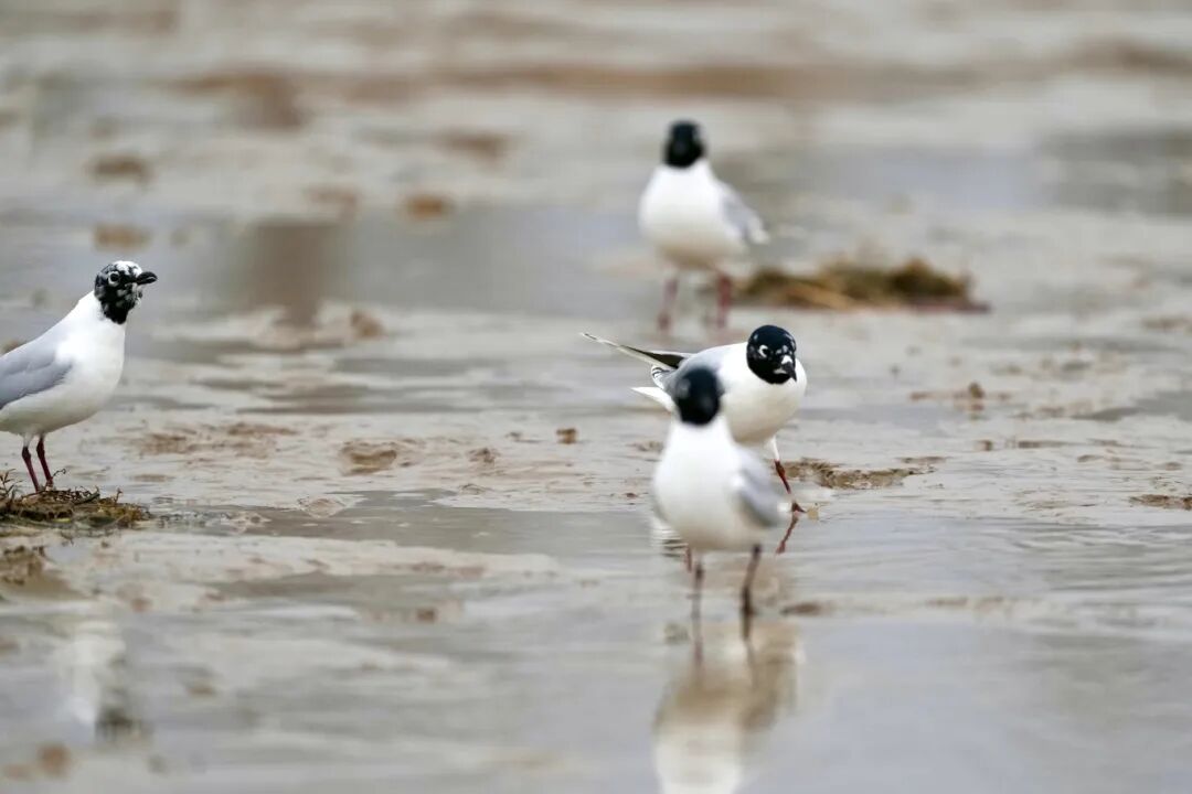 Flocks of Eurasian oystercatchers, Saunders's gulls and other species forage in groups. The mudflats witness thousands of birds taking flight together, their chirps rising and falling, forming a delightful scene with the tides and mudflats and exuding the full vitality of spring.